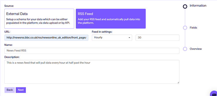 - Input the RSS URL and select how often you would like the data to be fed into the platform (from weekly to daily, or even more regular than that if required)