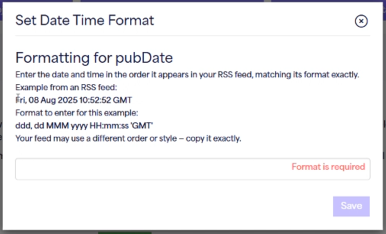 - On the pubDate field, you will be required to align your date/time formatting with whatever appears within your feed. So for example, if the feed shows Fri, 08 Aug 2025 10:52:52 GMT that would be translated as ddd, dd MMM yyyy HH:mm:ss ‘GMT’, if the timezone is not specified as text, e.g. “+00:00:00” you can instead use ‘zzz’.