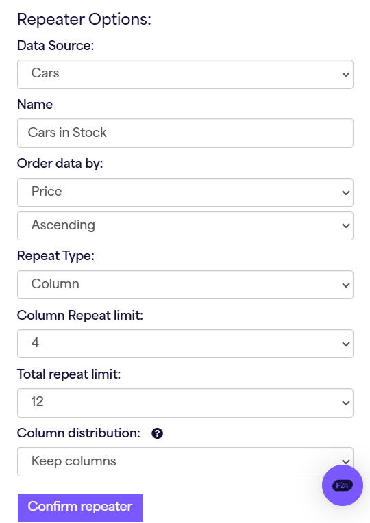 - After selecting this option, you will be required to choose what external data object you would like to connect the snippet to, and input your repeater settings options. This includes things like ‘repeat type’, the order of the repeating, and the number of times it will be repeated.