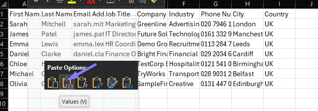 - Right-click on cell A1 in the new sheet and select Paste as values.