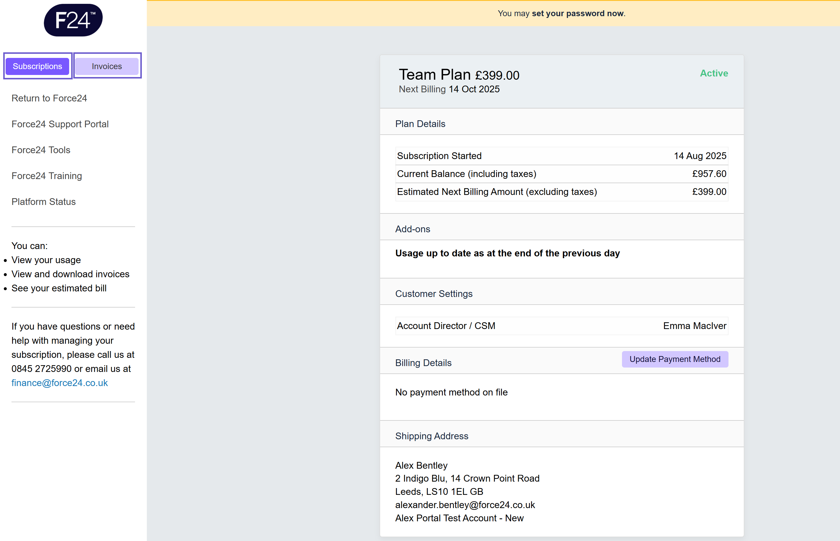 The Billing Portal allows your organisation’s master user or Finance Team to access a secure dashboard containing all billing information related to your Force24 account.