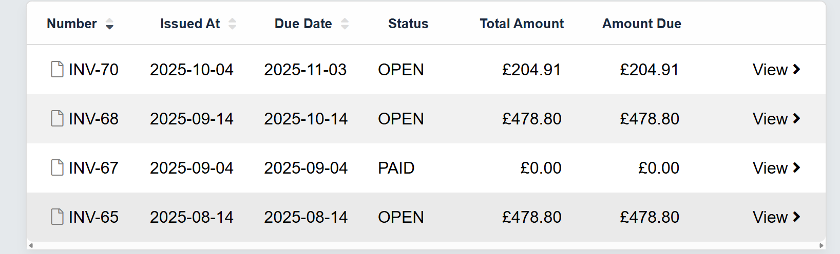 View all historic invoices – including which have been paid, and which remain outstanding.