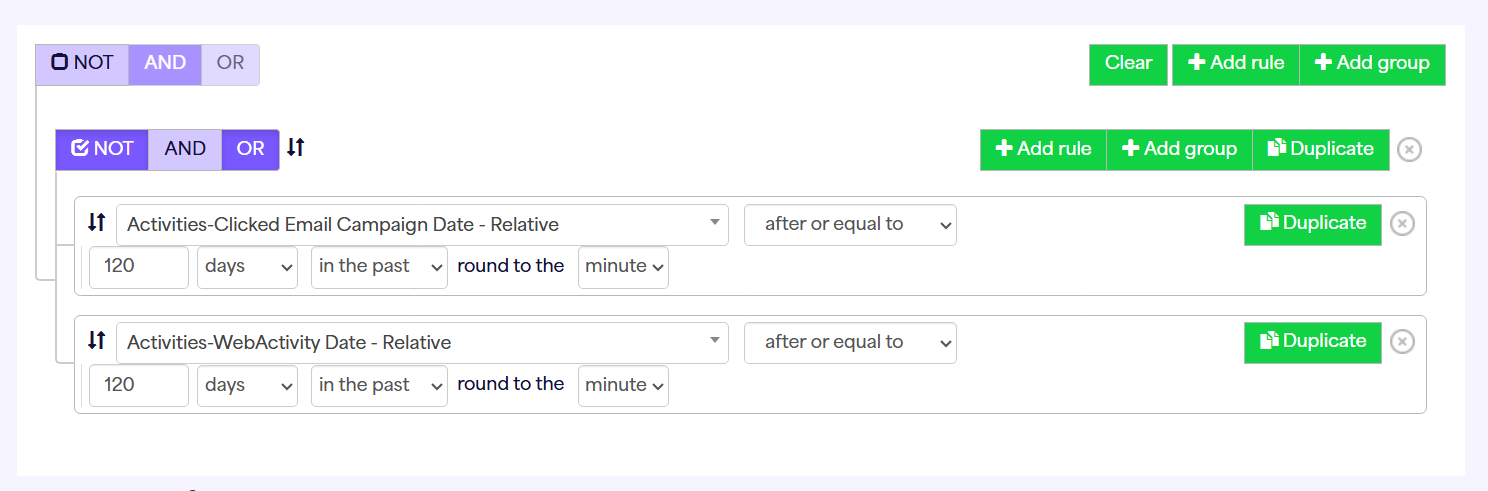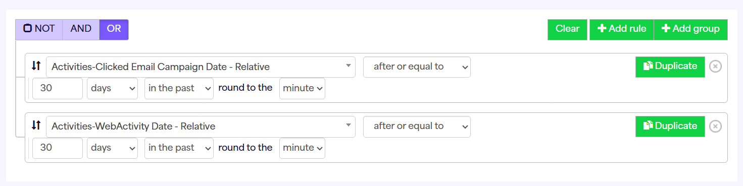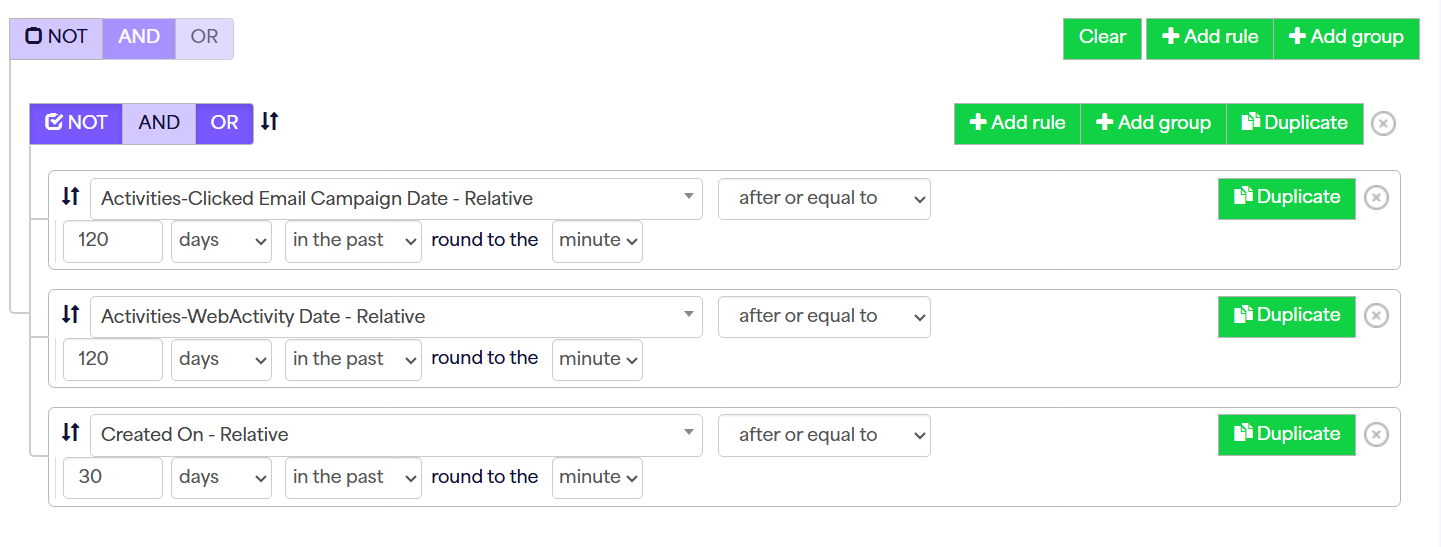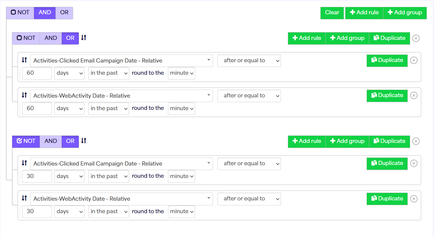 For the examples below, we will be looking for contacts that have either clicked or had web activity as signs of engagement, but you can use any combination of the available rules including email opens, if desired. For the specific time frames we will be using 30 day increments, but you can replicate this using different lengths of time depending on your industry/audience/buying cycle etc.